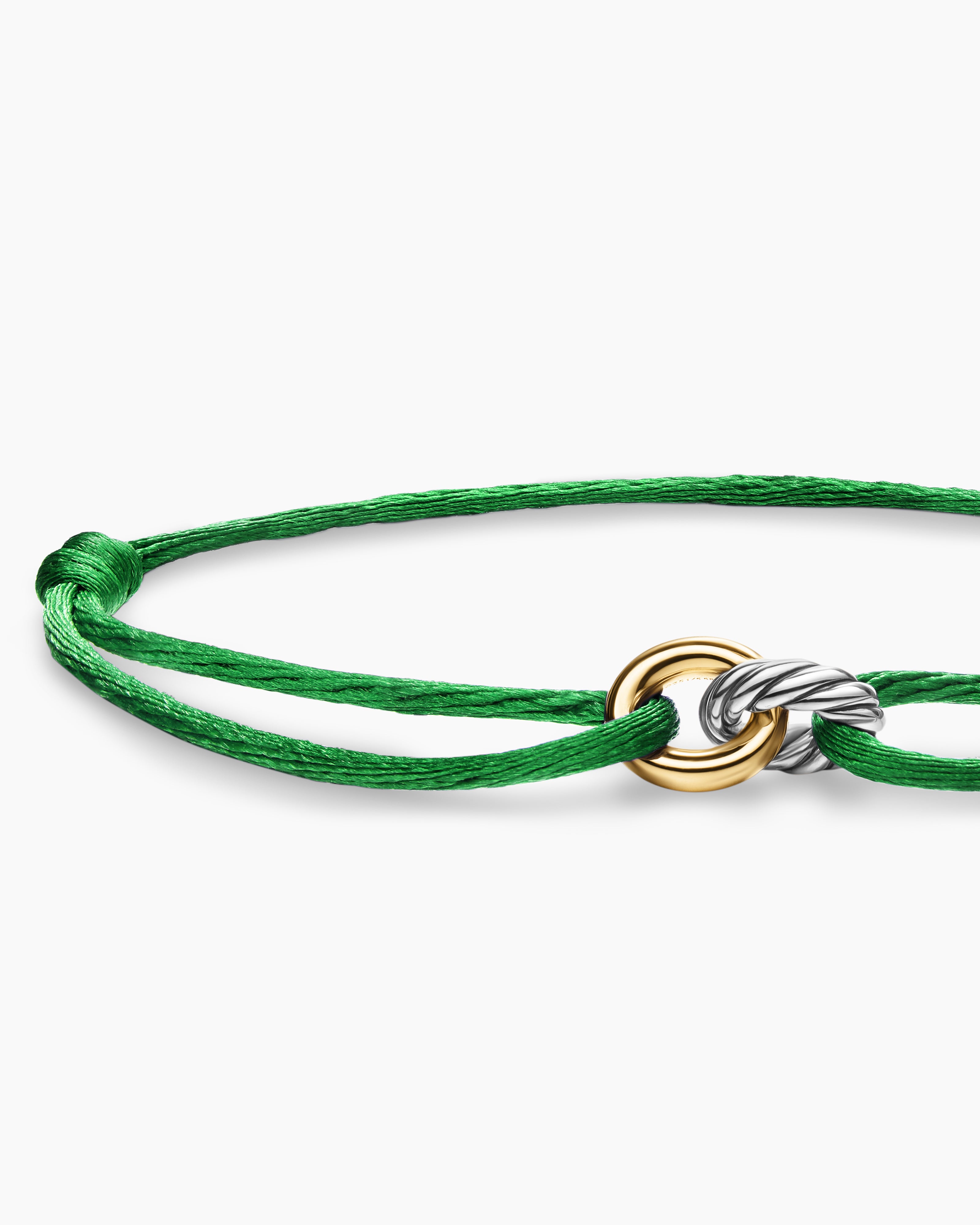 Sculpted Cable Linked Cord Bracelet Green Nylon with Sterling Silver and 14K Yellow Gold, 8.7mm