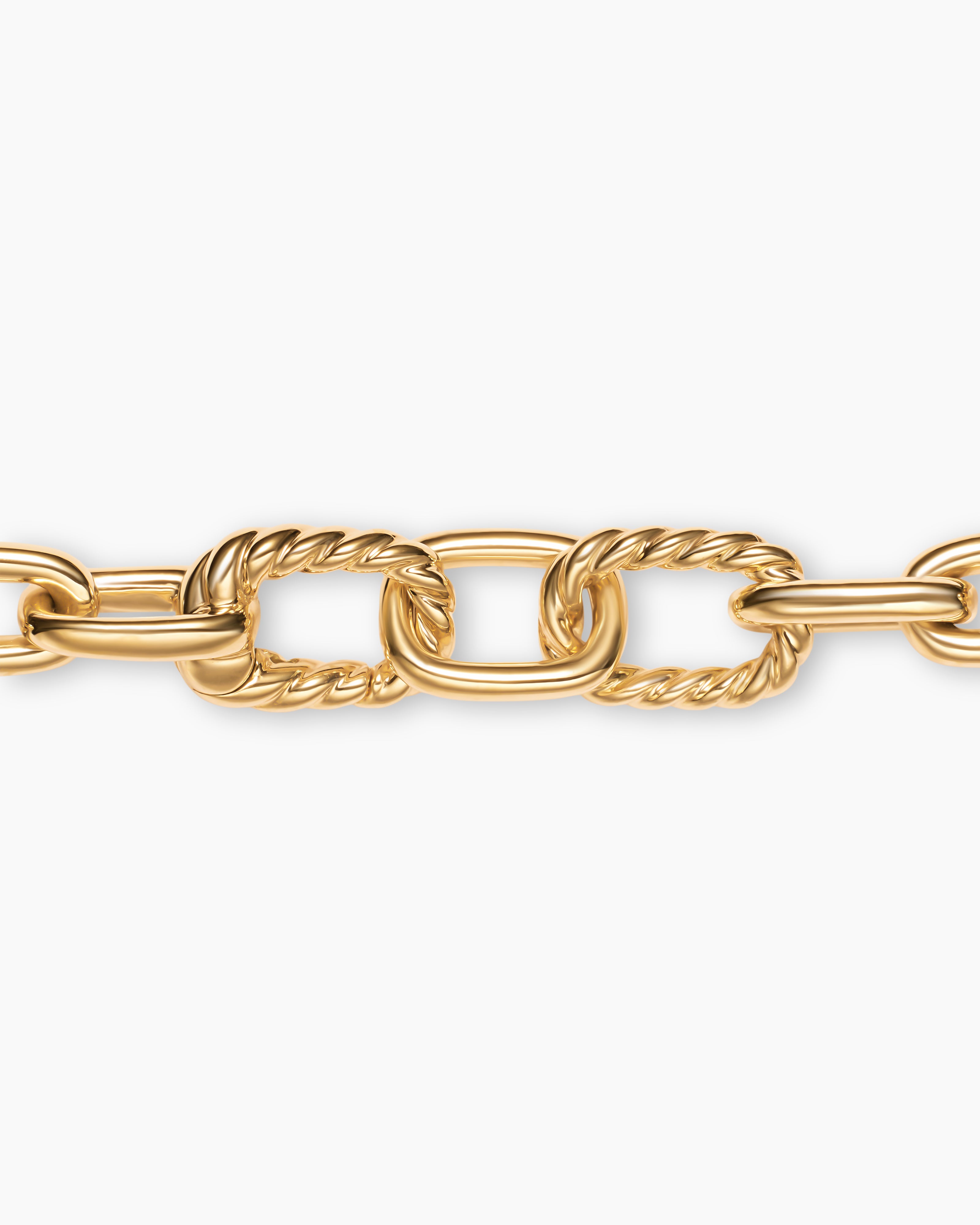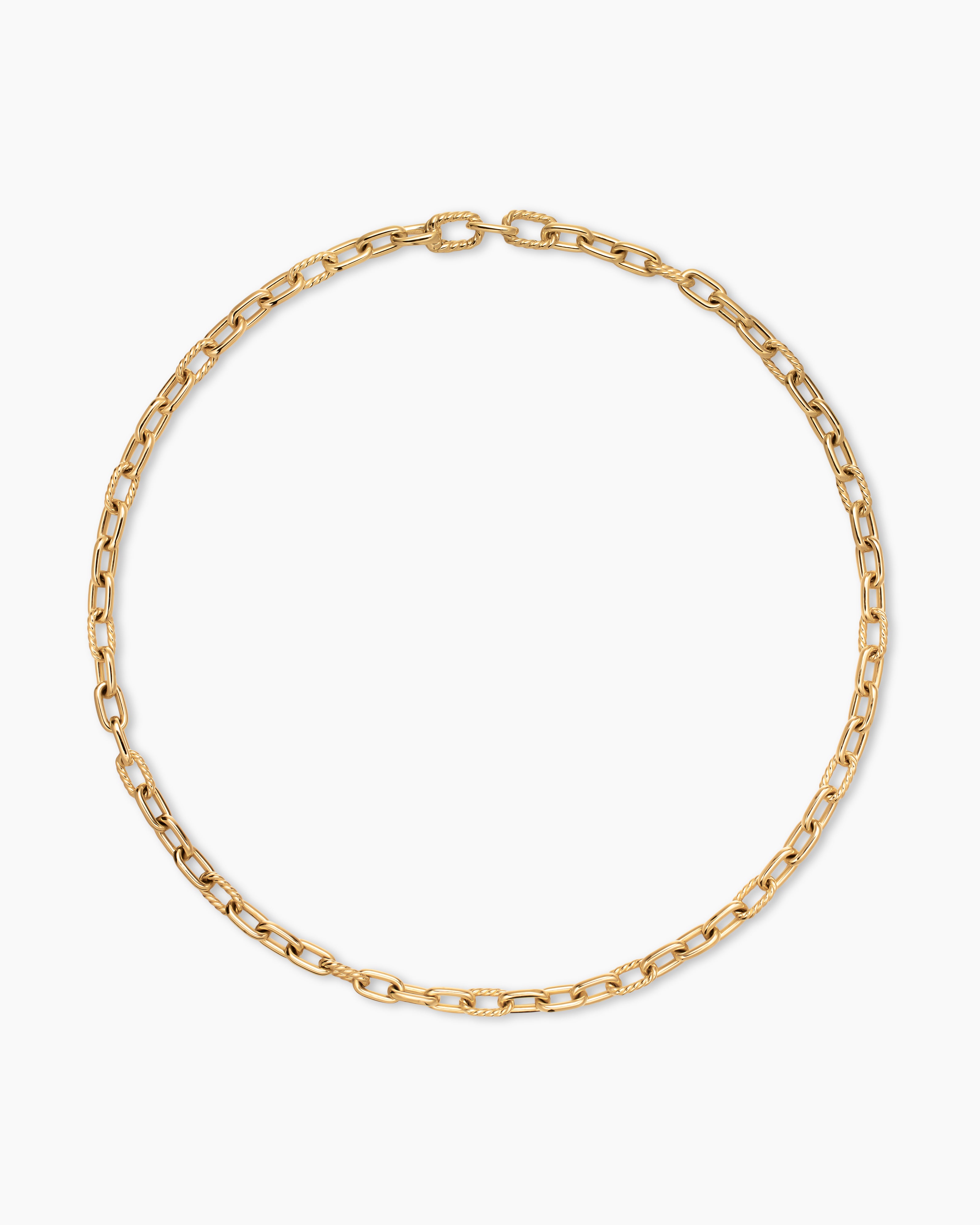 Oval links in an array of sizes and scales juxtapose clean lines with textured Cable details. Each link's unique form echoes the rounded corners of another David Yurman signature: the cushion cut. The bracelets, necklaces, earrings, and rings are available in both solid and mixed metals, including sterling silver, yellow and rose gold, with the occasional addition of pearls.