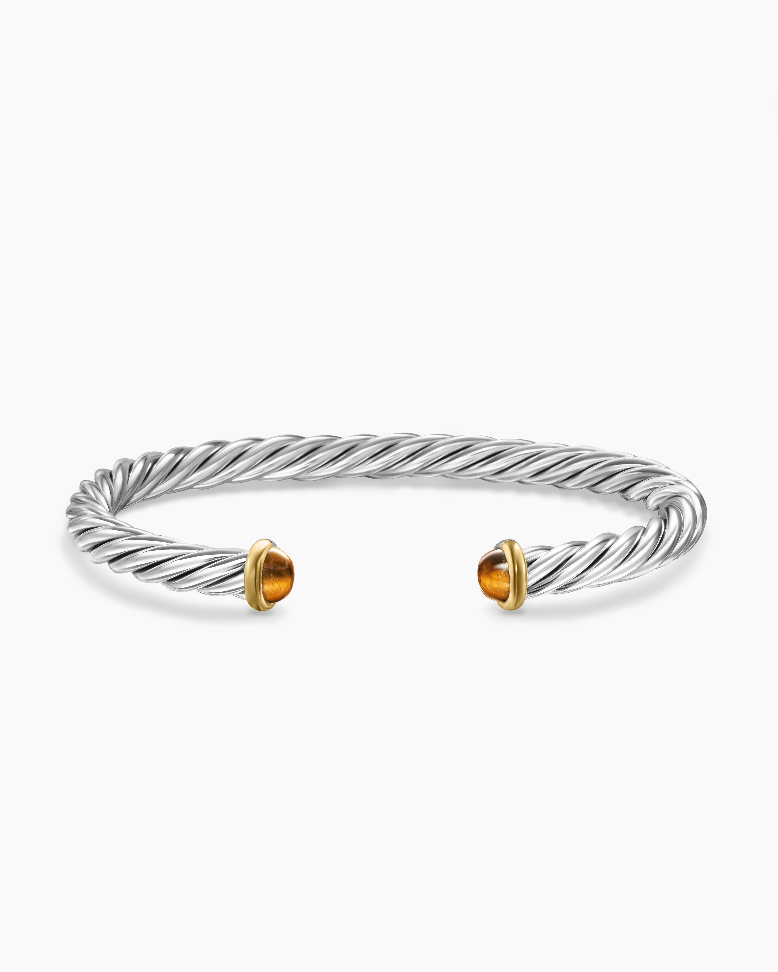 Cable Cuff Bracelet Sterling Silver with 14K Yellow Gold and Tiger's Eye, 6mm