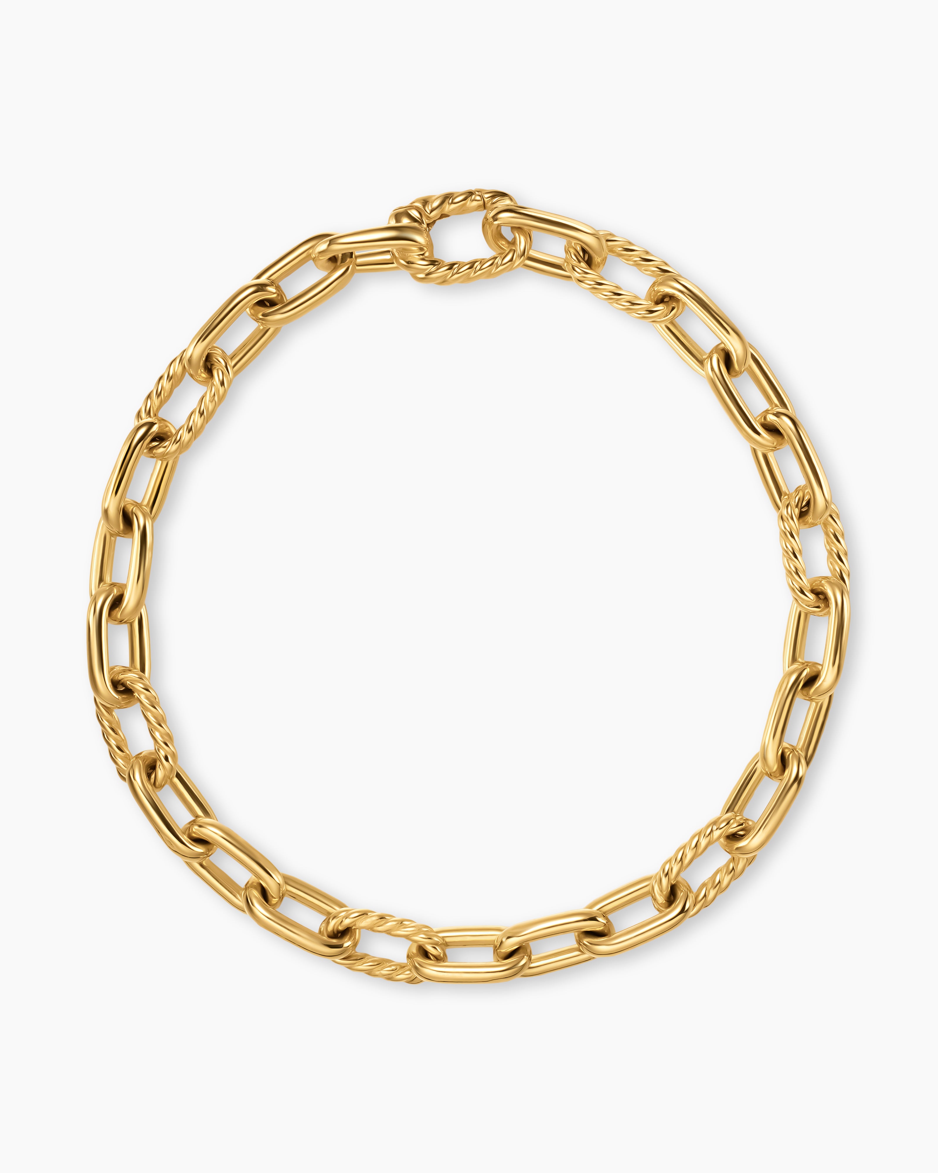 Oval links in an array of sizes and scales juxtapose clean lines with textured Cable details. Each link's unique form echoes the rounded corners of another David Yurman signature: the cushion cut. The bracelets, necklaces, earrings, and rings are available in both solid and mixed metals, including sterling silver, yellow and rose gold, with the occasional addition of pearls.
