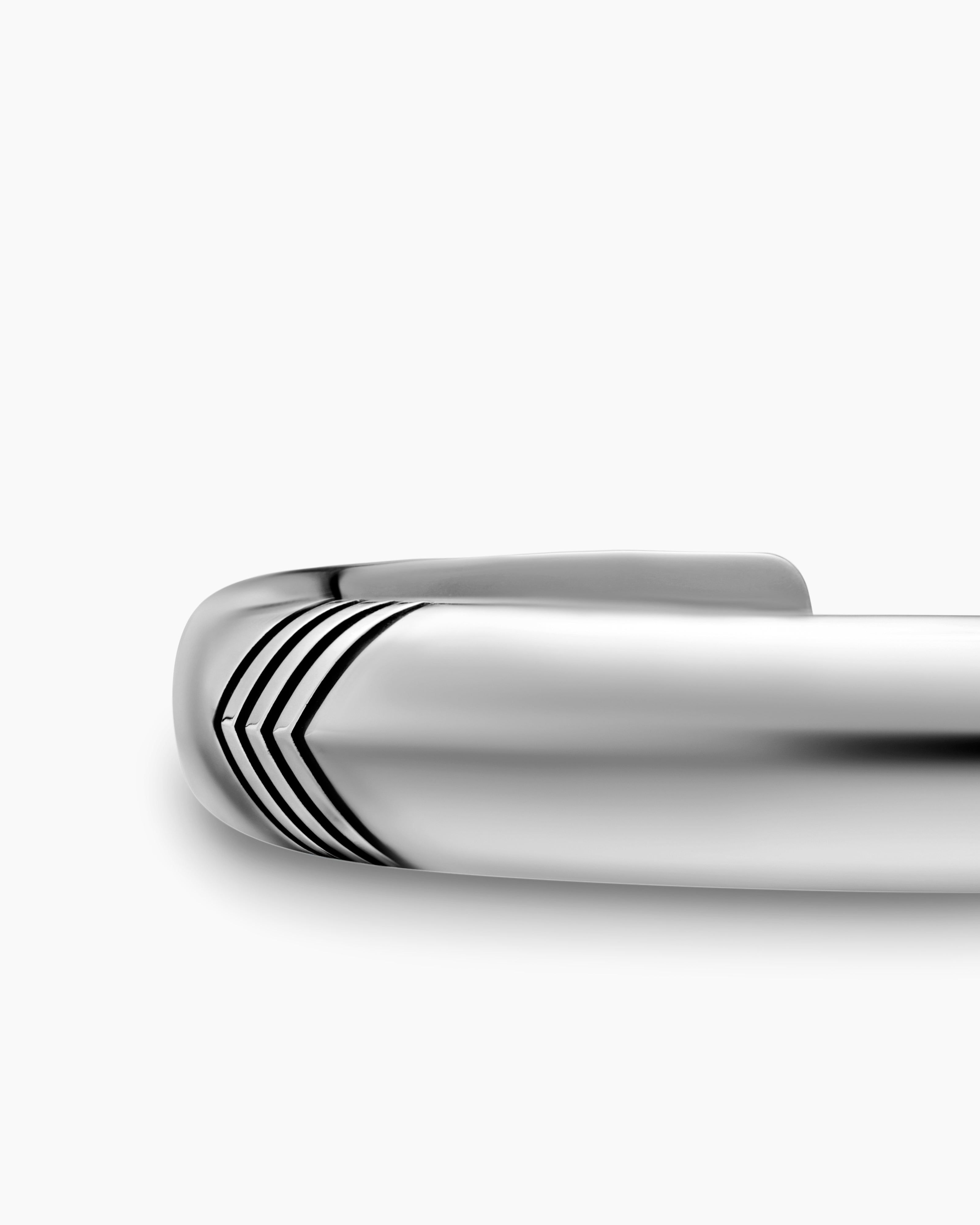 Comme de nombreux motifs de David Yurman, Chevron joue avec l’ombre et la lumière. Les rainures profondément sculptées dans le design sont souvent oxydées pour contraster avec les cannelures hautement polies.