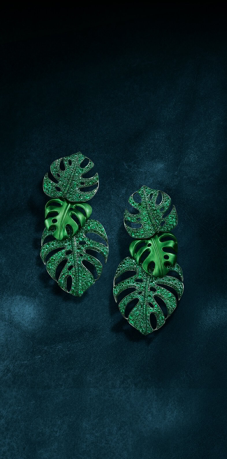 The Palm collection honors the wild beauty of tropical flora, as seen in these one-of-a-kind Monstera Earrings, each leaf carved by hand from close study of the living plant. Crafted in our New York atelier from 18K white gold and aluminum, anodized to match the luminous green of sunlit foliage, the pair is artistically set with 12.25 carats of color-matched emeralds in varying sizes. Our signature mosaic pavé creates a dynamic play of light—a fantastical tribute to nature’s perfect imperfections.