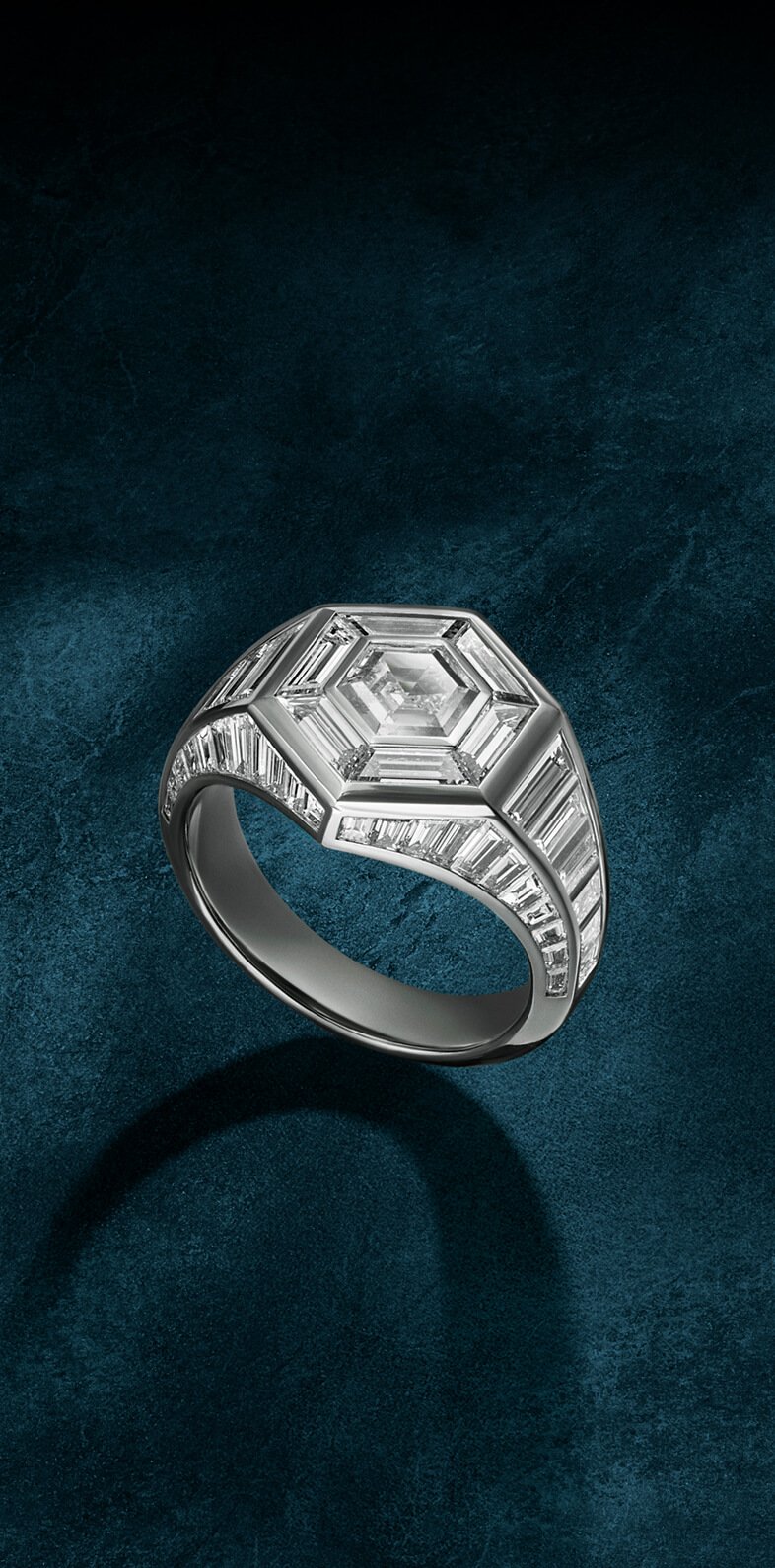 Inspired by the towering silhouettes of Art Deco architecture, this one-of-a-kind Deco Signet Ring channels the movement’s bold geometry into a striking, sculptural form. Meticulously hand-set with 6.96 carats of G/VS+ diamonds—62 custom-cut baguettes, in addition to the certified center stone—its hexagonal form is precision-engineered to reflect the symmetry and ornamental detail that defined the groundbreaking era.
