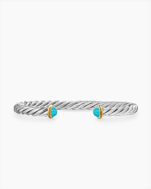Cable Cuff Bracelet Sterling Silver with 14K Yellow Gold and Turquoise, 6mm