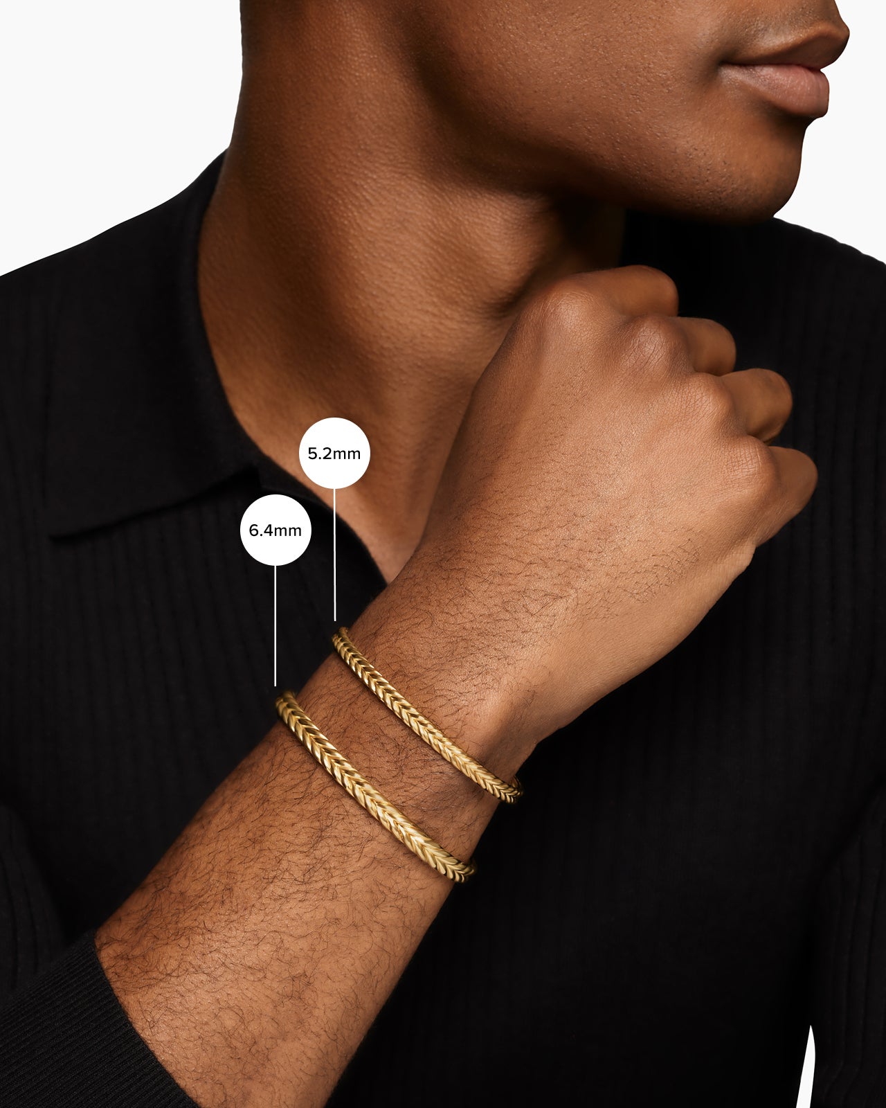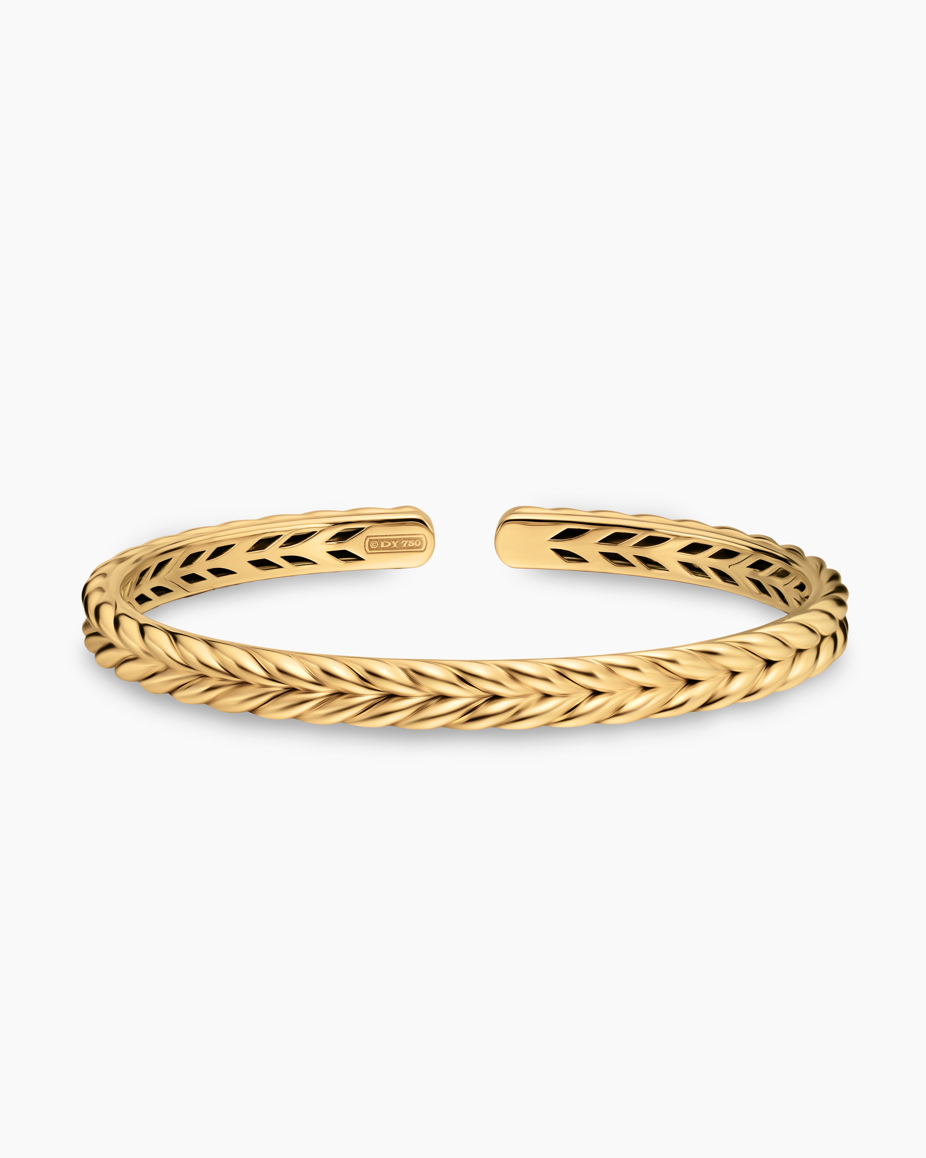 Like many David Yurman motifs, Chevron is a play on light and dark. The deeply carved valleys in the design are often oxidized to contrast with the highly polished flutes.