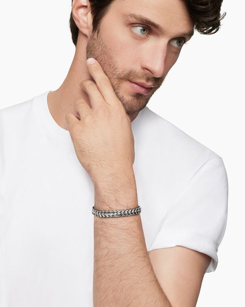 Like many David Yurman motifs, Chevron is a play on light and dark. The deeply carved valleys in the design are often oxidized to contrast with the highly polished flutes.