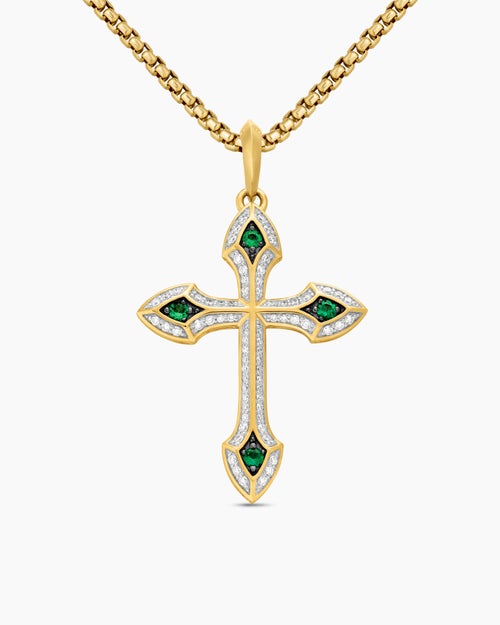 Gothic Cross Pendant 18K Yellow Gold with Diamonds and Emeralds, 36.5mm