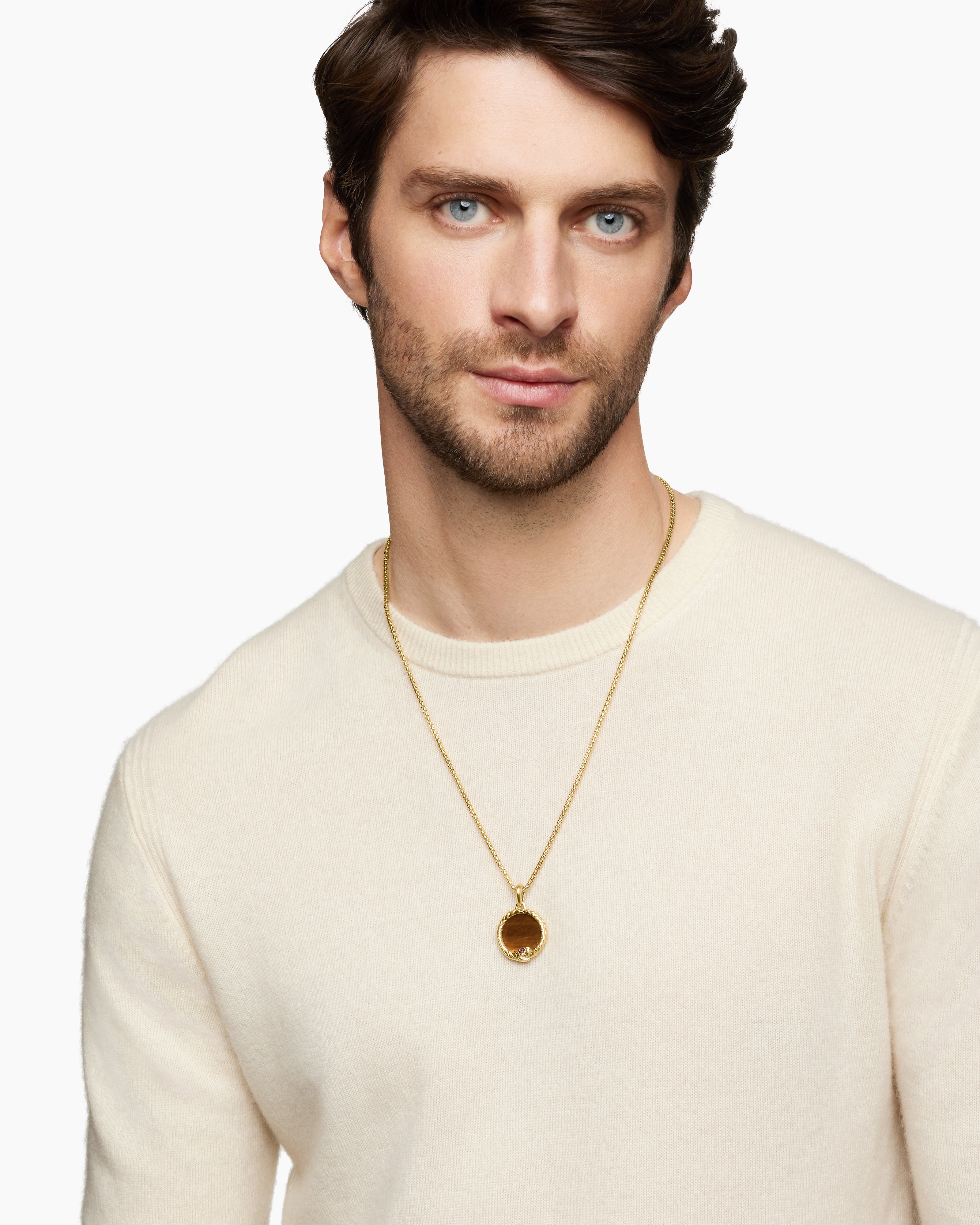Every amulet is a work of art, featuring precision-cut rare stones, diamond pavé, and precious metals with hand-carved details. From symbols of ideology and faith such as crosses, saints, and Stars of David to shields, evil eyes, and astrological signs, amulets are all about creating your own signature—and story. Wear them alone or stacked on metal chains, waxed cotton cords, bracelets, or even earrings.