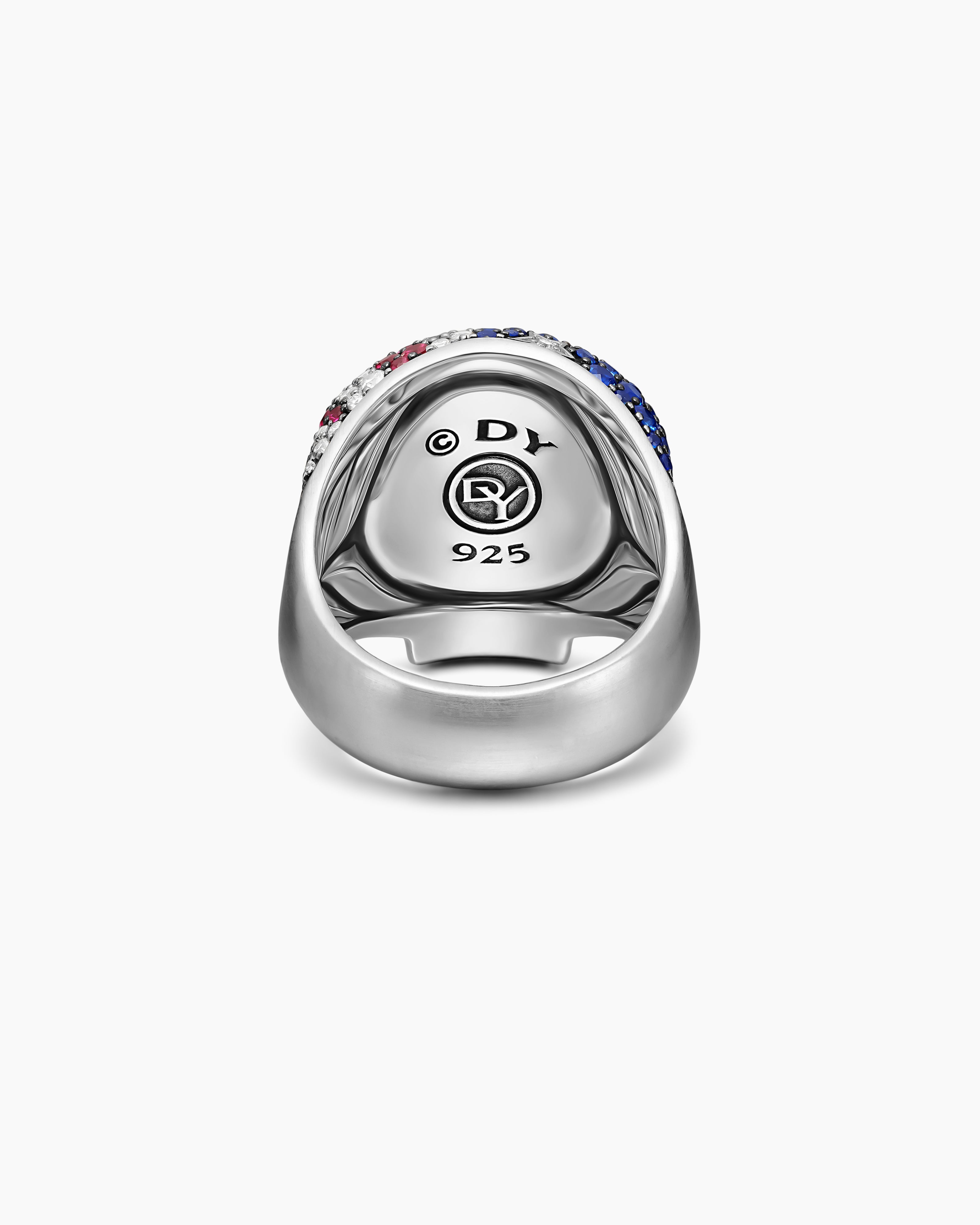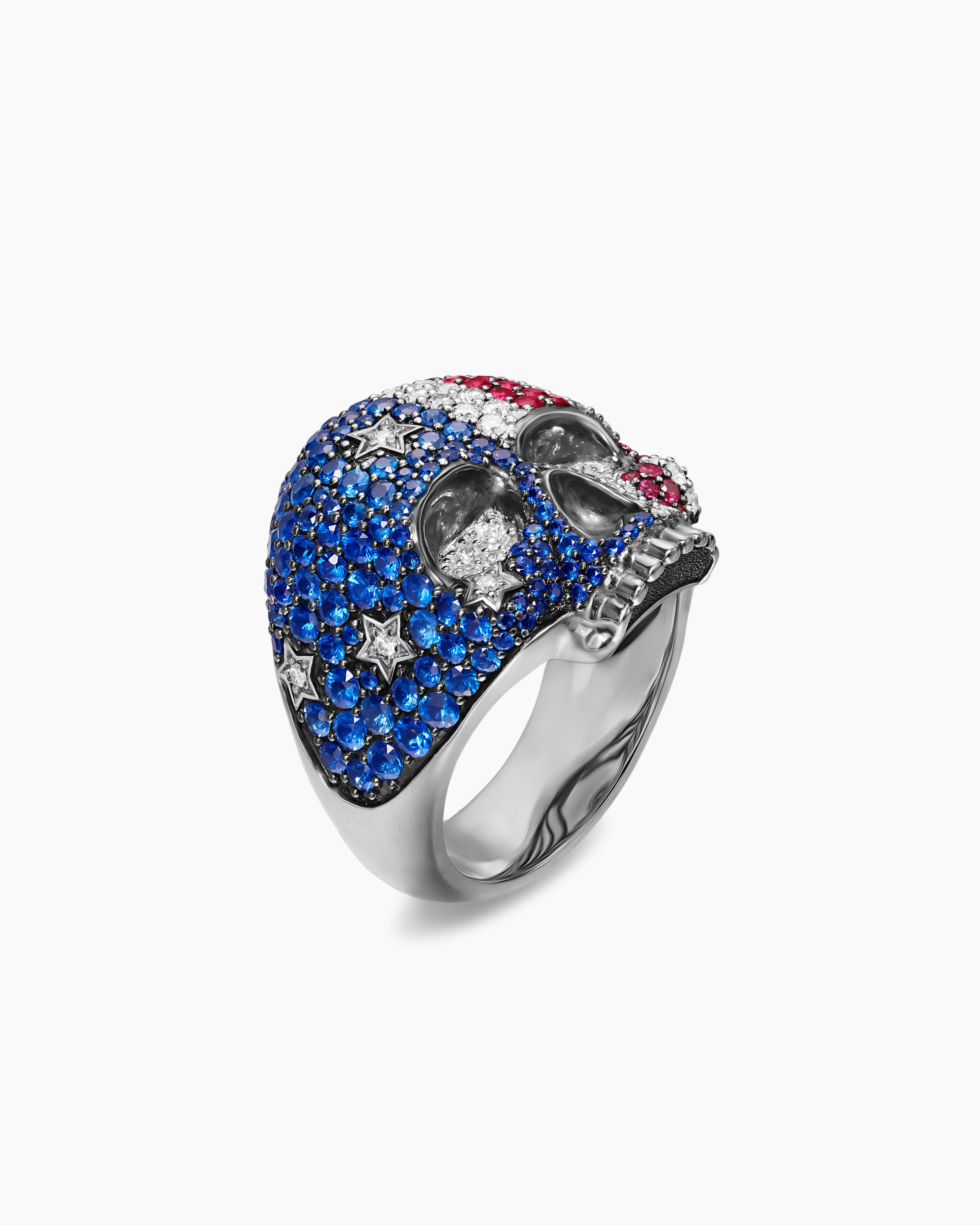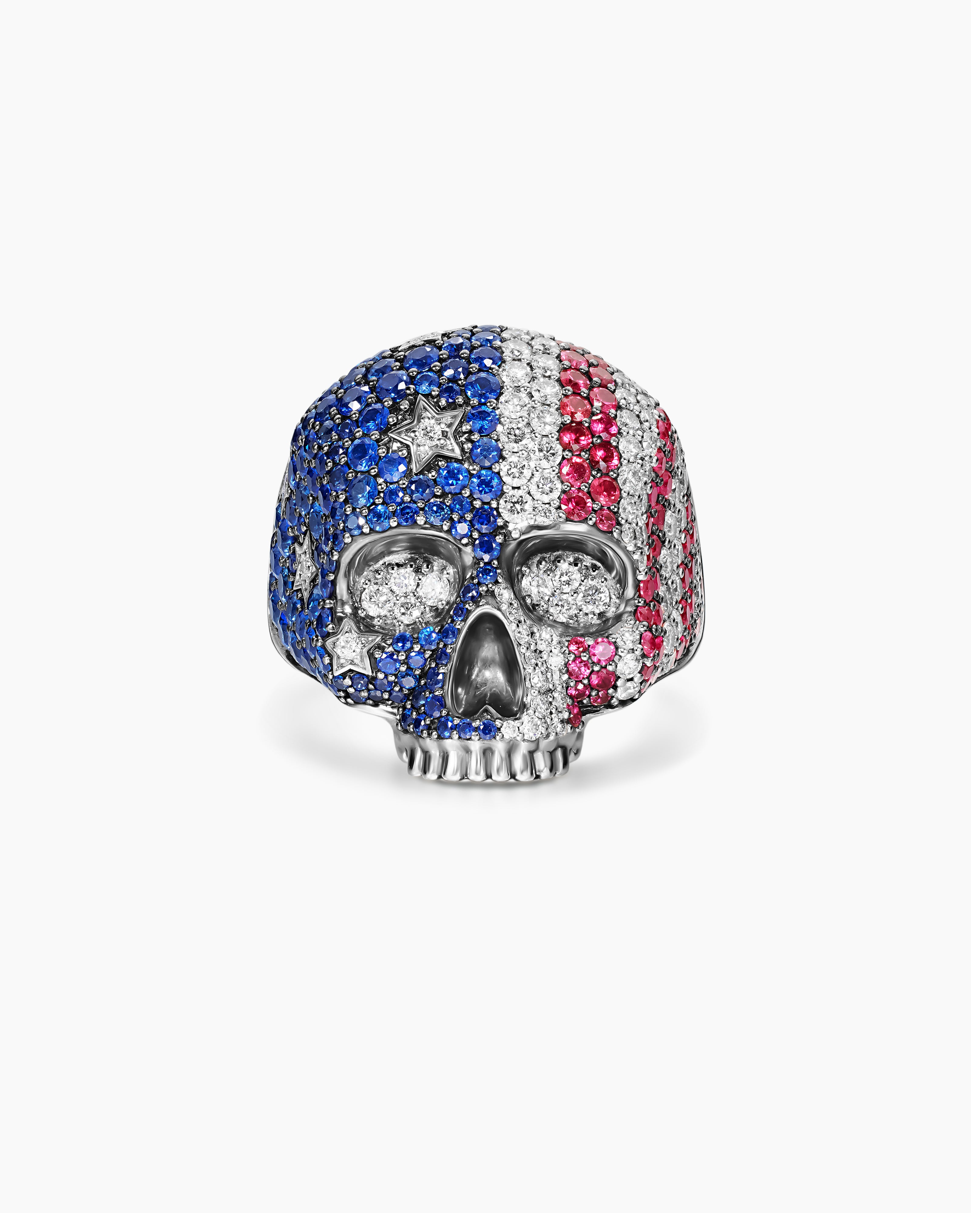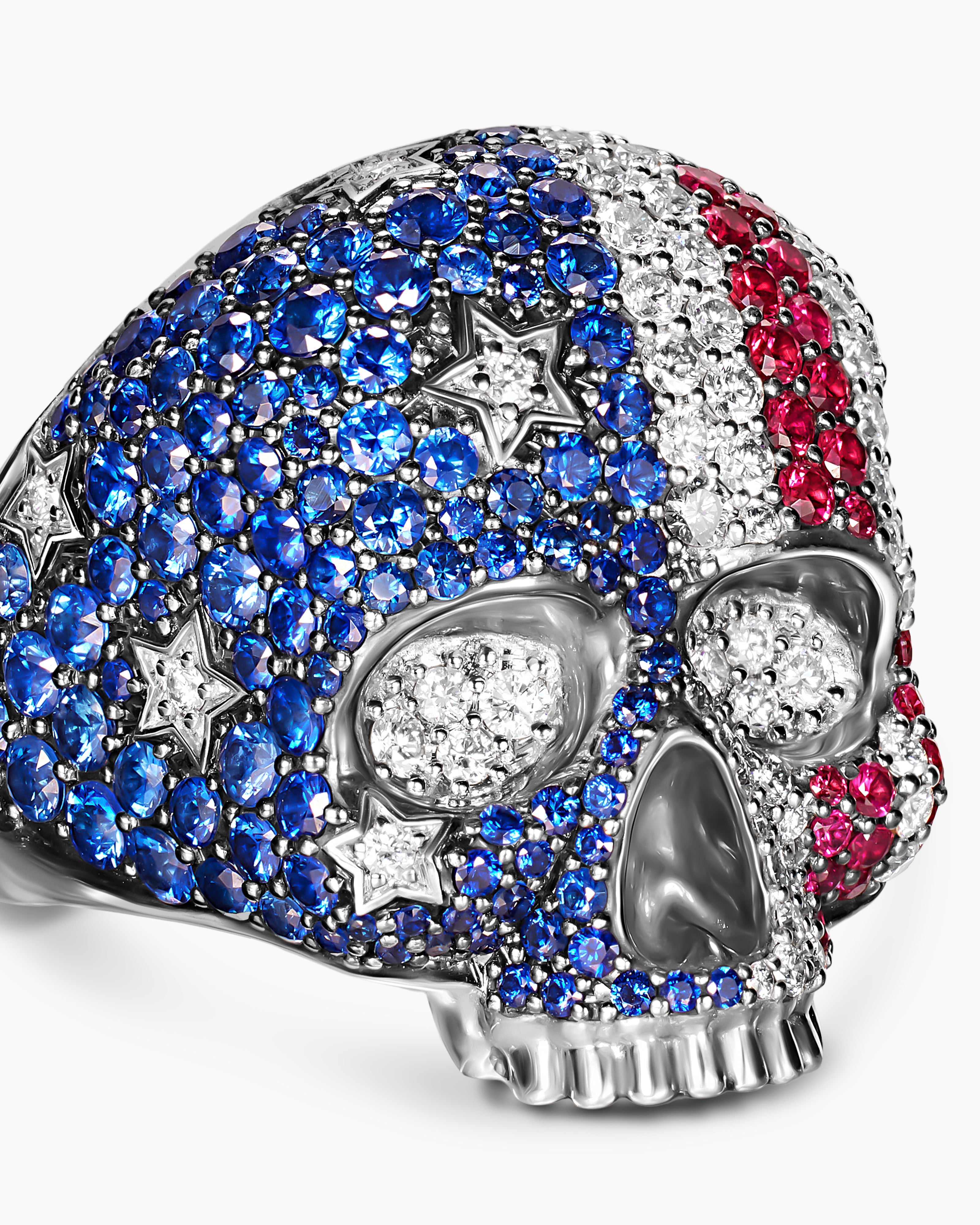 American Flag Pavé Skull Ring Sterling Silver with Sapphires, Diamonds and Rubies, 25.3mm