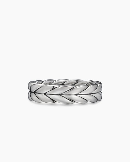 Like many David Yurman motifs, Chevron is a play on light and dark. The deeply carved valleys in the design are often oxidized to contrast with the highly polished flutes.