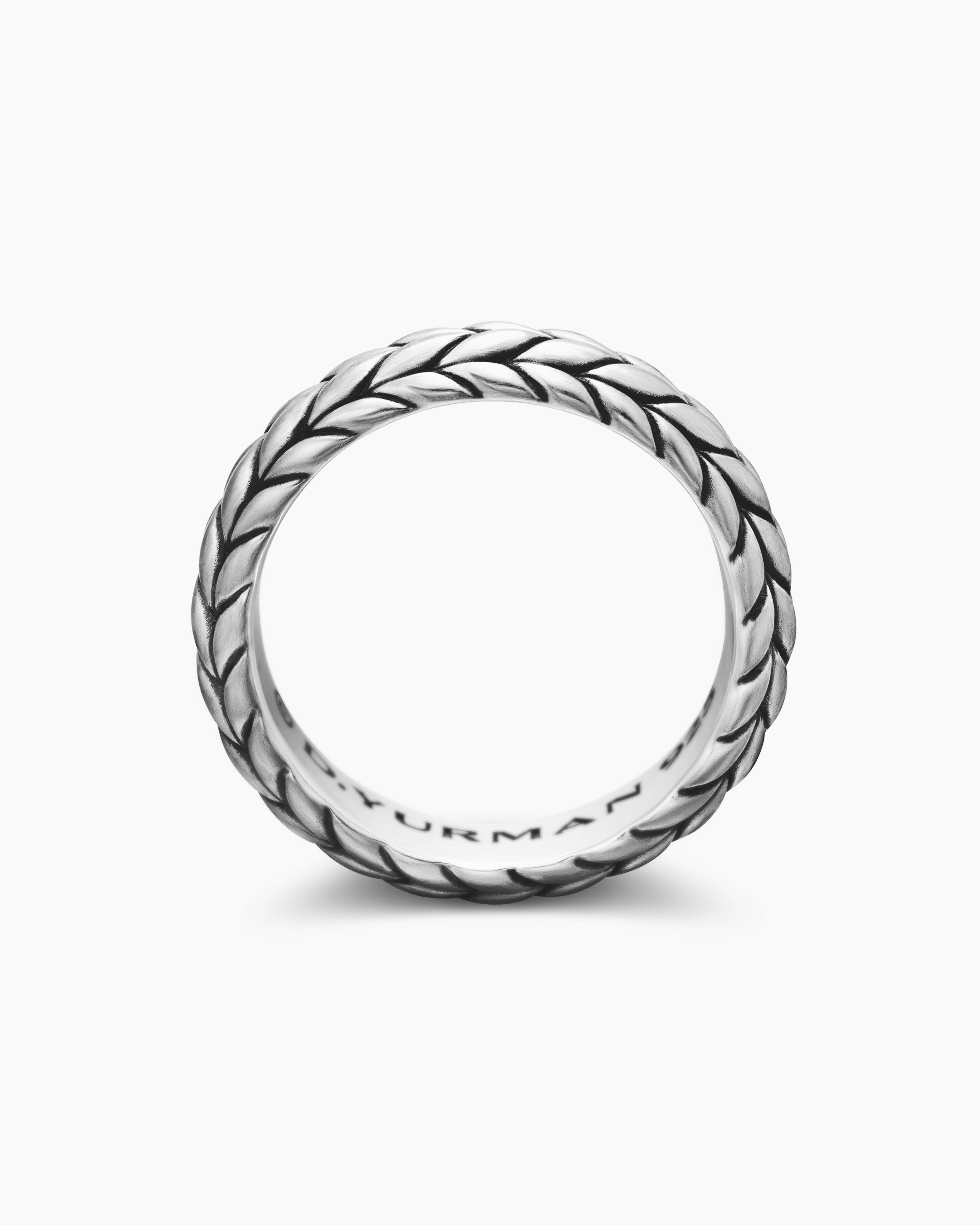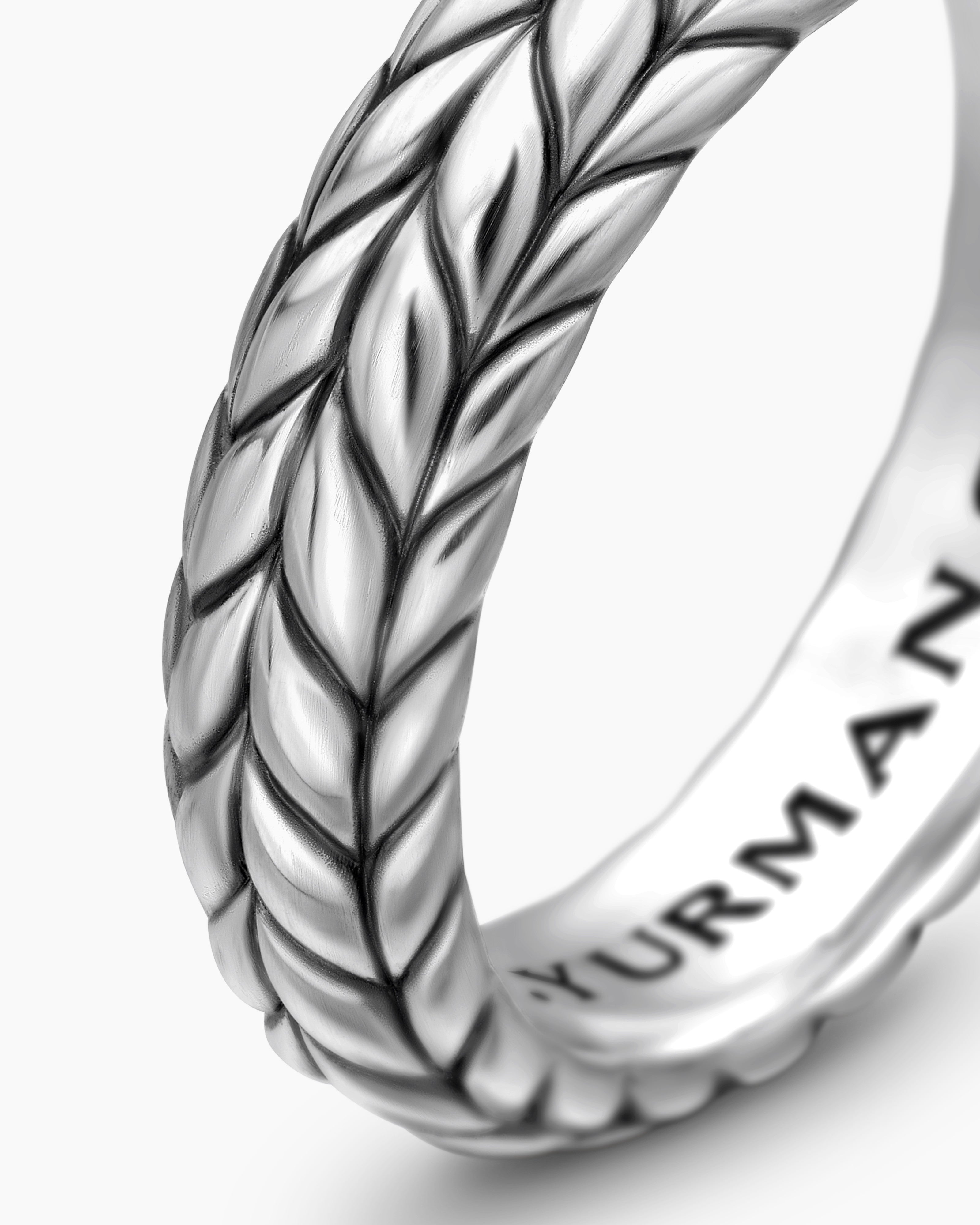 Like many David Yurman motifs, Chevron is a play on light and dark. The deeply carved valleys in the design are often oxidized to contrast with the highly polished flutes.