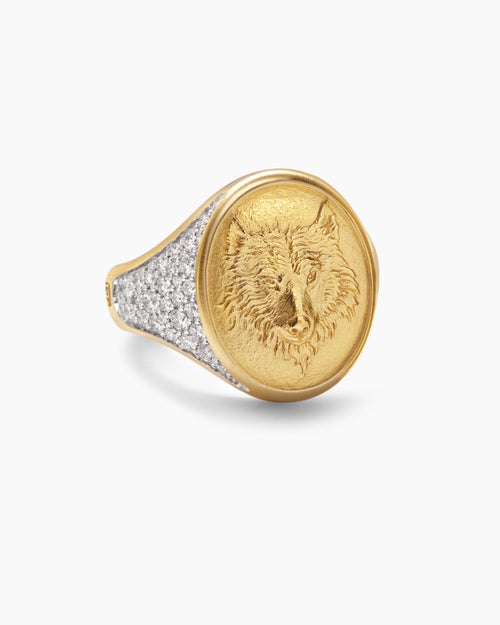 Petrvs® Wolf Signet Ring 18K Yellow Gold with Diamonds, 21.5mm