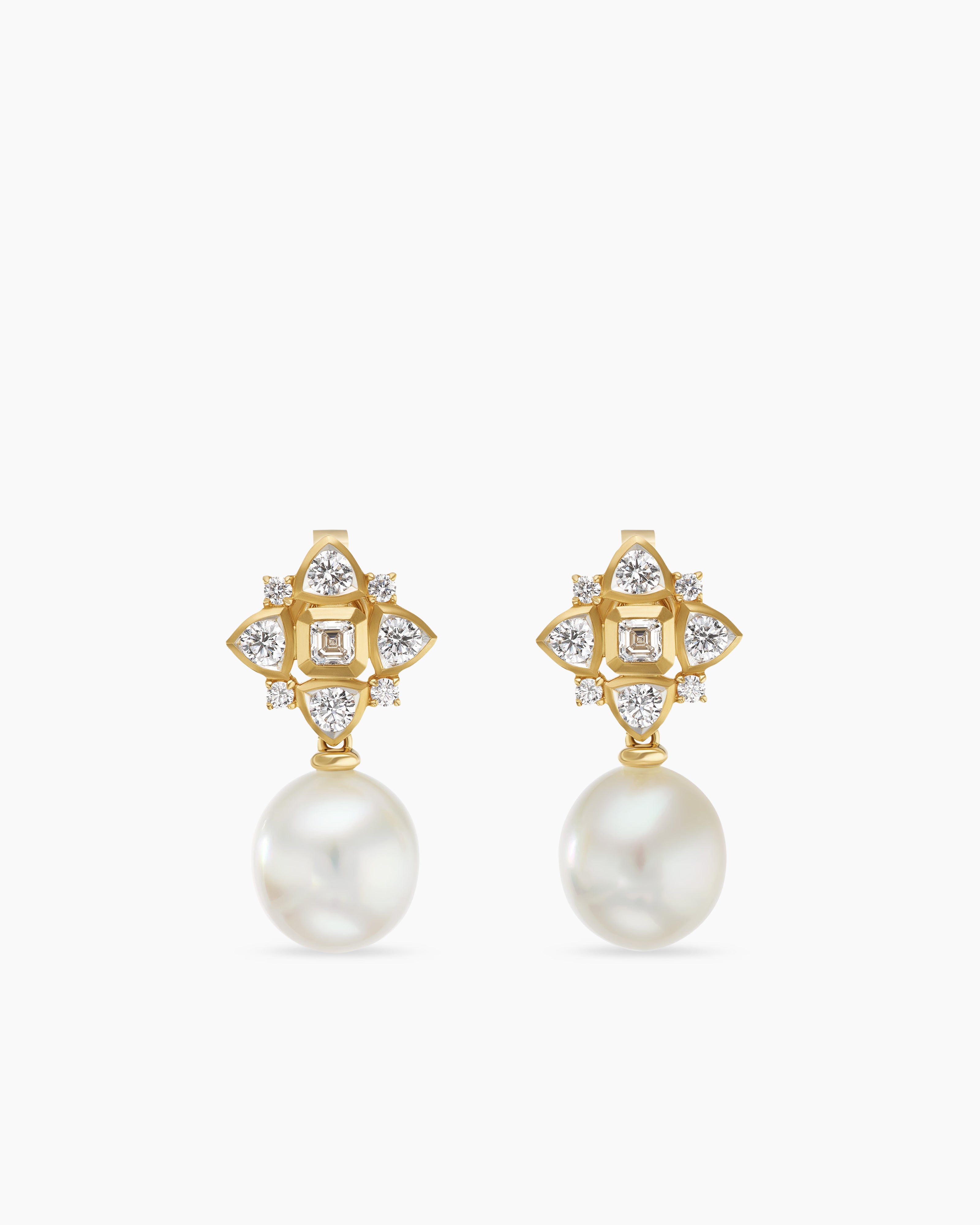 Renaissance® Pearl Trillion Drop Earrings 18K Yellow Gold with Pearls and Diamond, 26mm