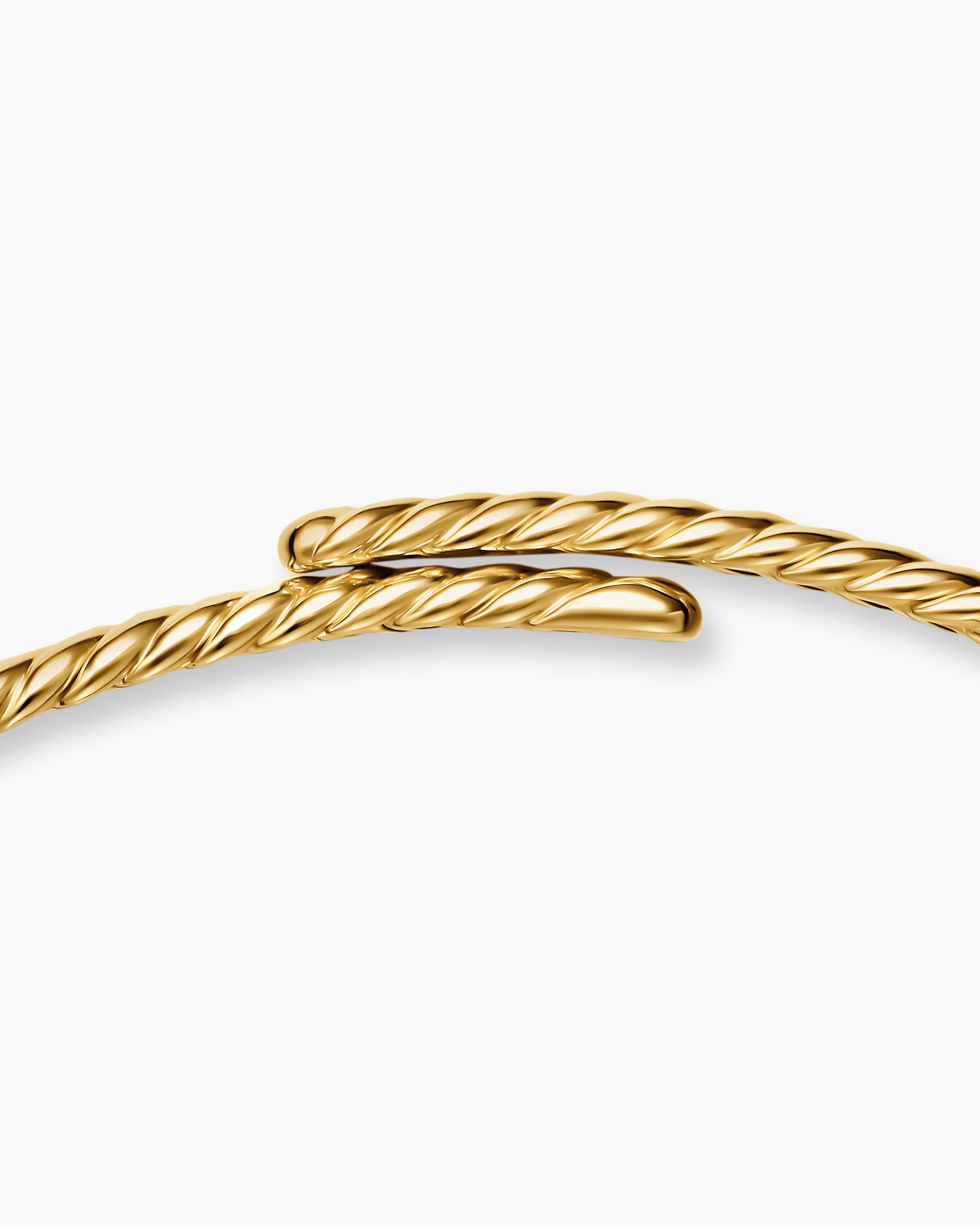 Throughout this collection, our signature Cable motif appears as a series of intricately carved, s-shaped flutes. These designs encompass a range of techniques and styles, from sculpted links connected with subtle hinges to pavé bangles finished by hand with a mosaic of individually set diamonds.