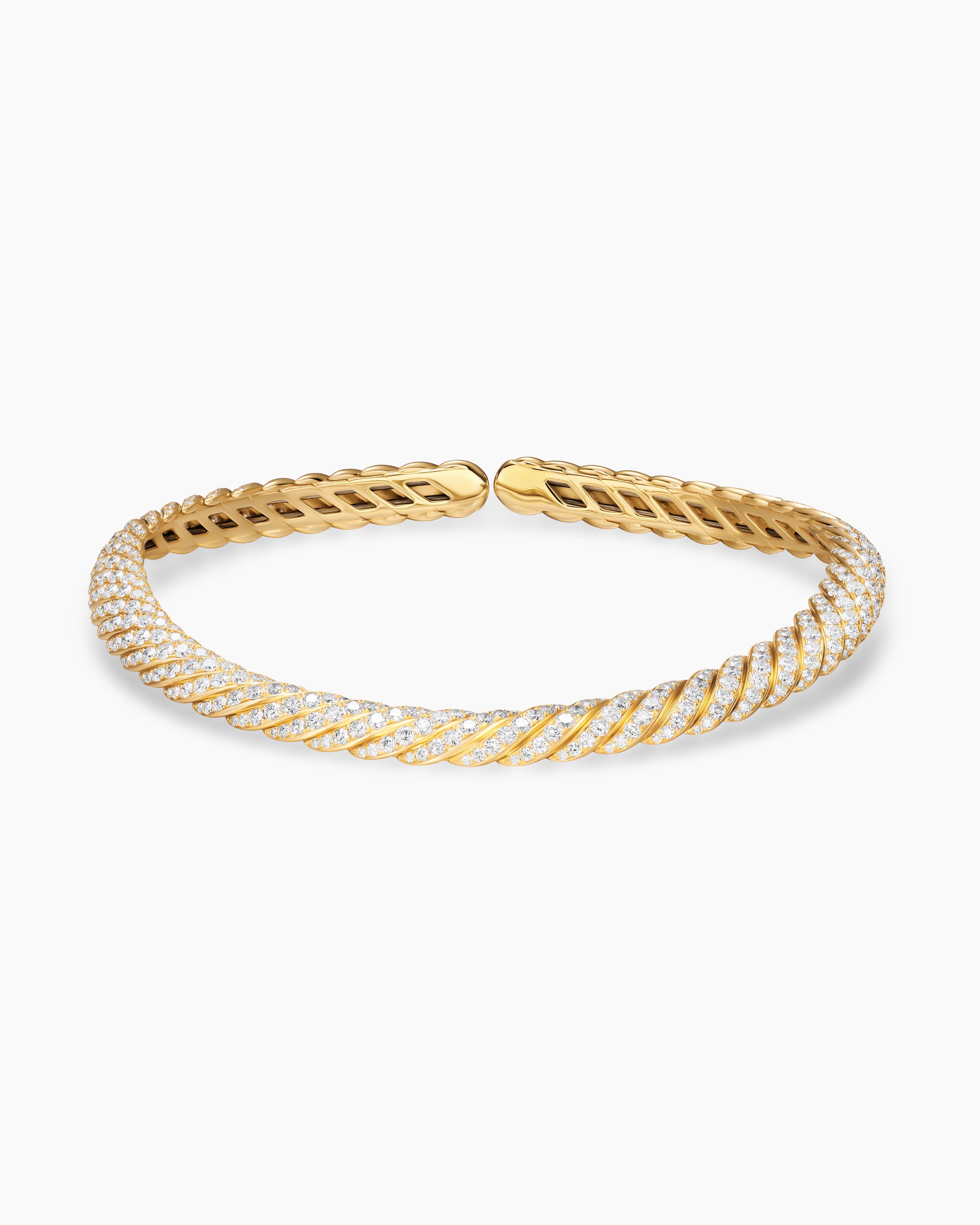 Throughout this collection, our signature Cable motif appears as a series of intricately carved, s-shaped flutes. These designs encompass a range of techniques and styles, from sculpted links connected with subtle hinges to pavé bangles finished by hand with a mosaic of individually set diamonds.