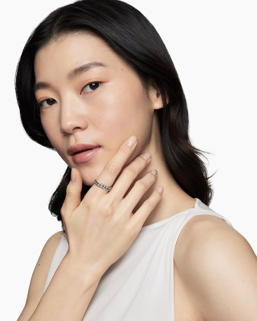 Use the white side of the provided David Yurman polishing cloth to gently wipe silver portions clean. Remove any remaining tarnish or impurities with mild diluted soap and warm water. Dry thoroughly before storing the design in its jewelry pouch.Complimentary cleaning is available at any David Yurman Boutique, simply schedule an appointment.