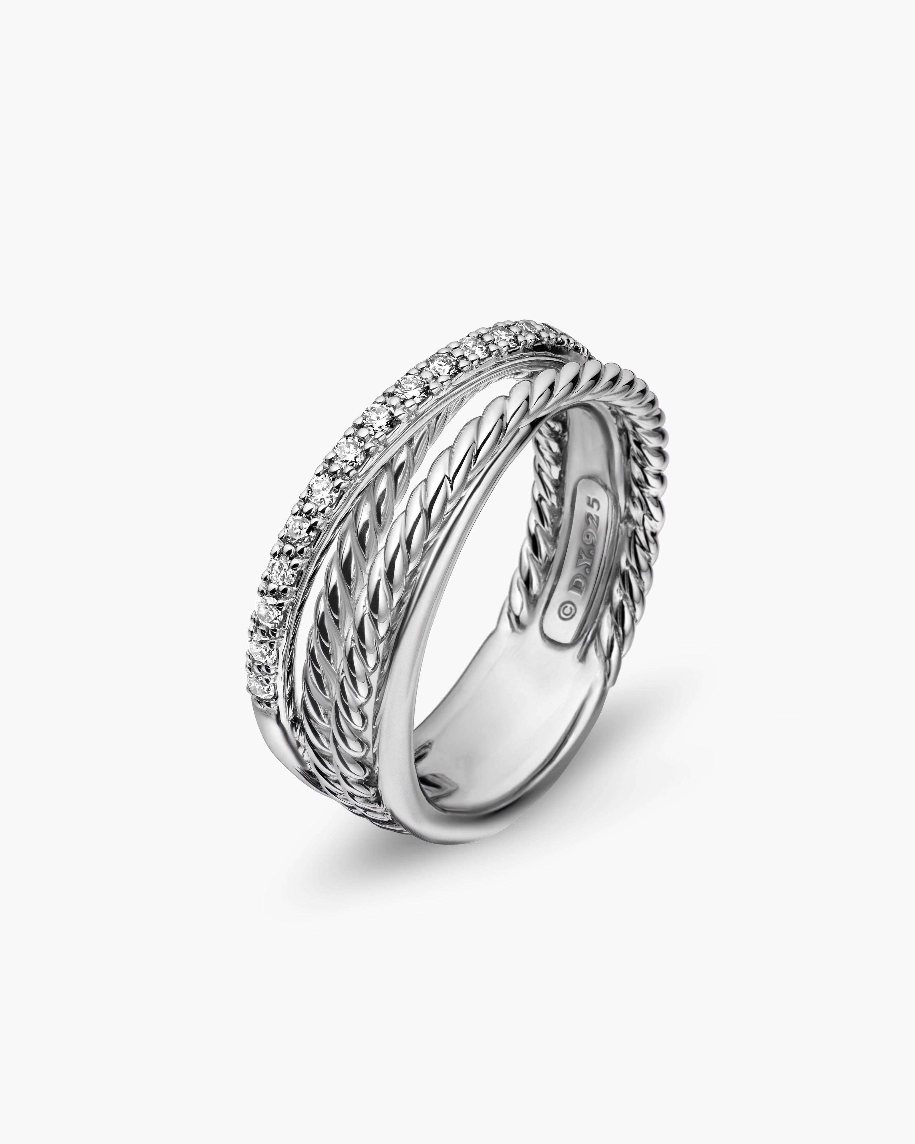 Using a dynamic range of smooth and Cabled cords, strands of silver or gold entwine to create a rhythmic cross of form and movement. The combination of gold and silver—now a David Yurman signature—is a key feature of the collection’s early iterations, which continues to evolve across rings, necklaces, bracelets, and earrings, often detailed with hand-set diamond pavé.