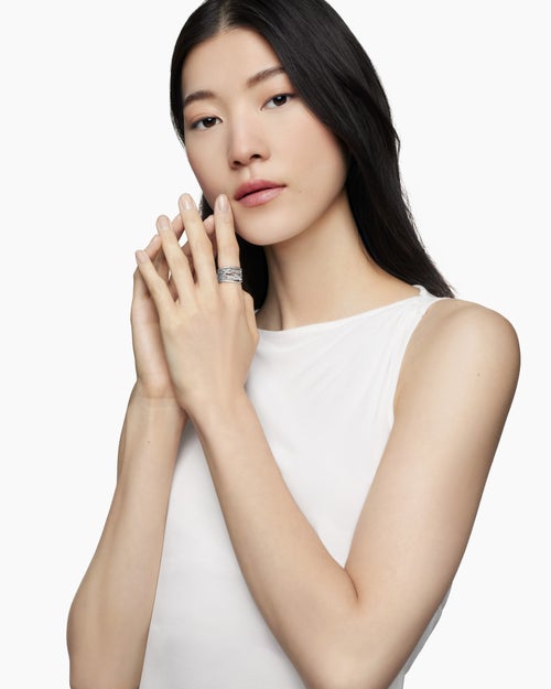Using a dynamic range of smooth and Cabled cords, strands of silver or gold entwine to create a rhythmic cross of form and movement. The combination of gold and silver—now a David Yurman signature—is a key feature of the collection’s early iterations, which continues to evolve across rings, necklaces, bracelets, and earrings, often detailed with hand-set diamond pavé.