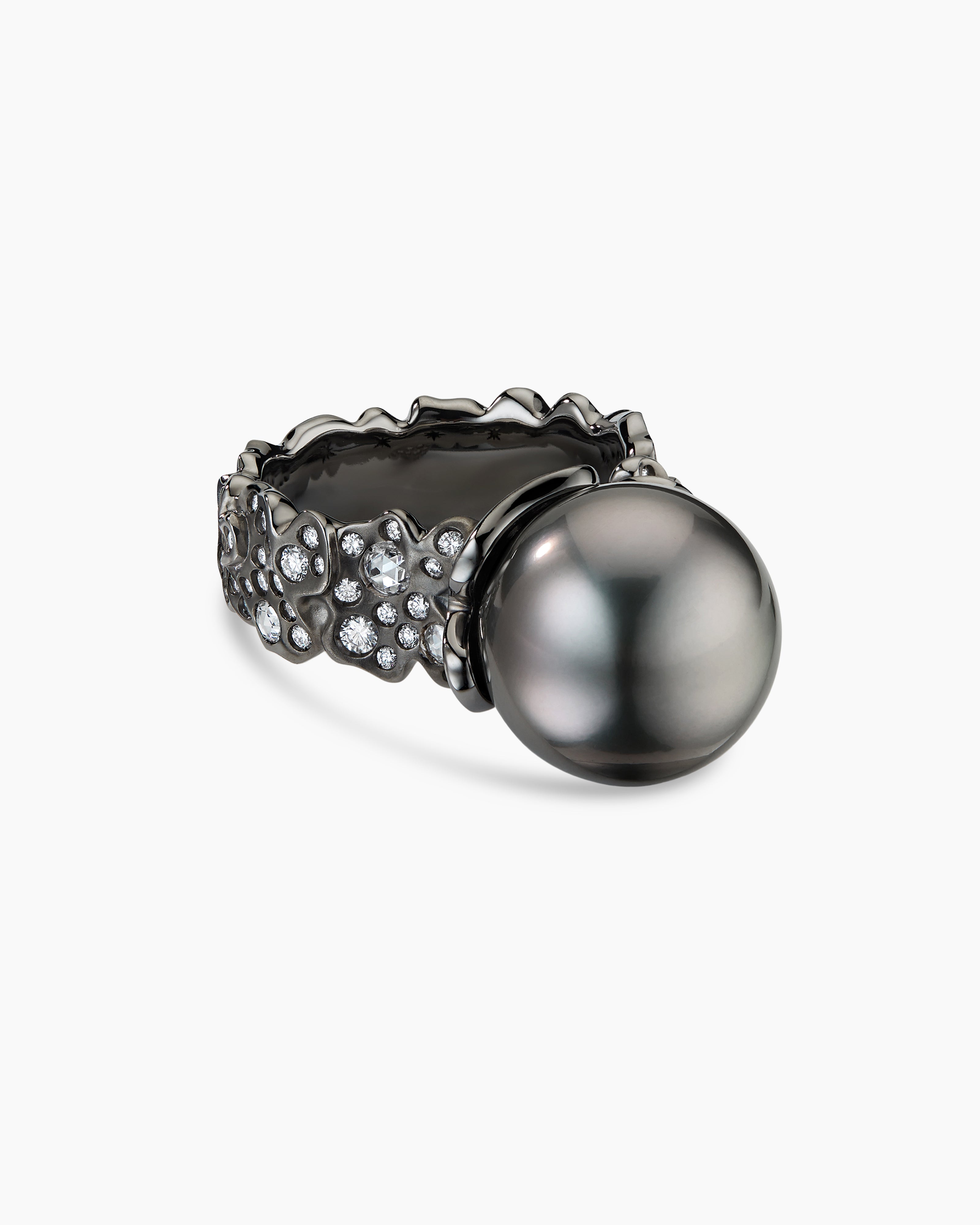 Petals and Pearl Ring White Gold with Rhodiated Black and Diamonds