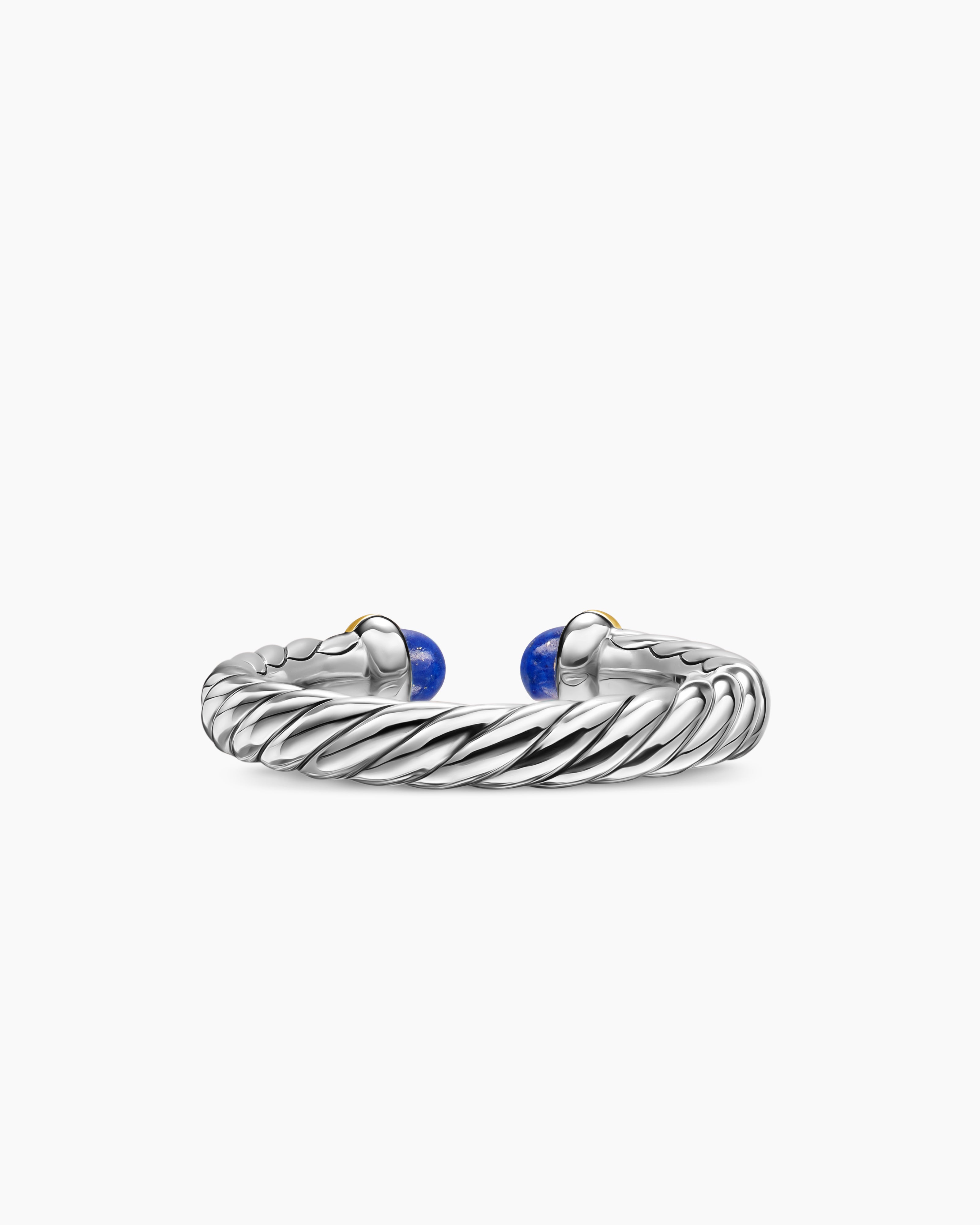Use the white side of the provided David Yurman polishing cloth to gently wipe silver portions clean. Remove any remaining tarnish or impurities with mild diluted soap and warm water. Dry thoroughly before storing the design in its jewelry pouch.Gemstone Care