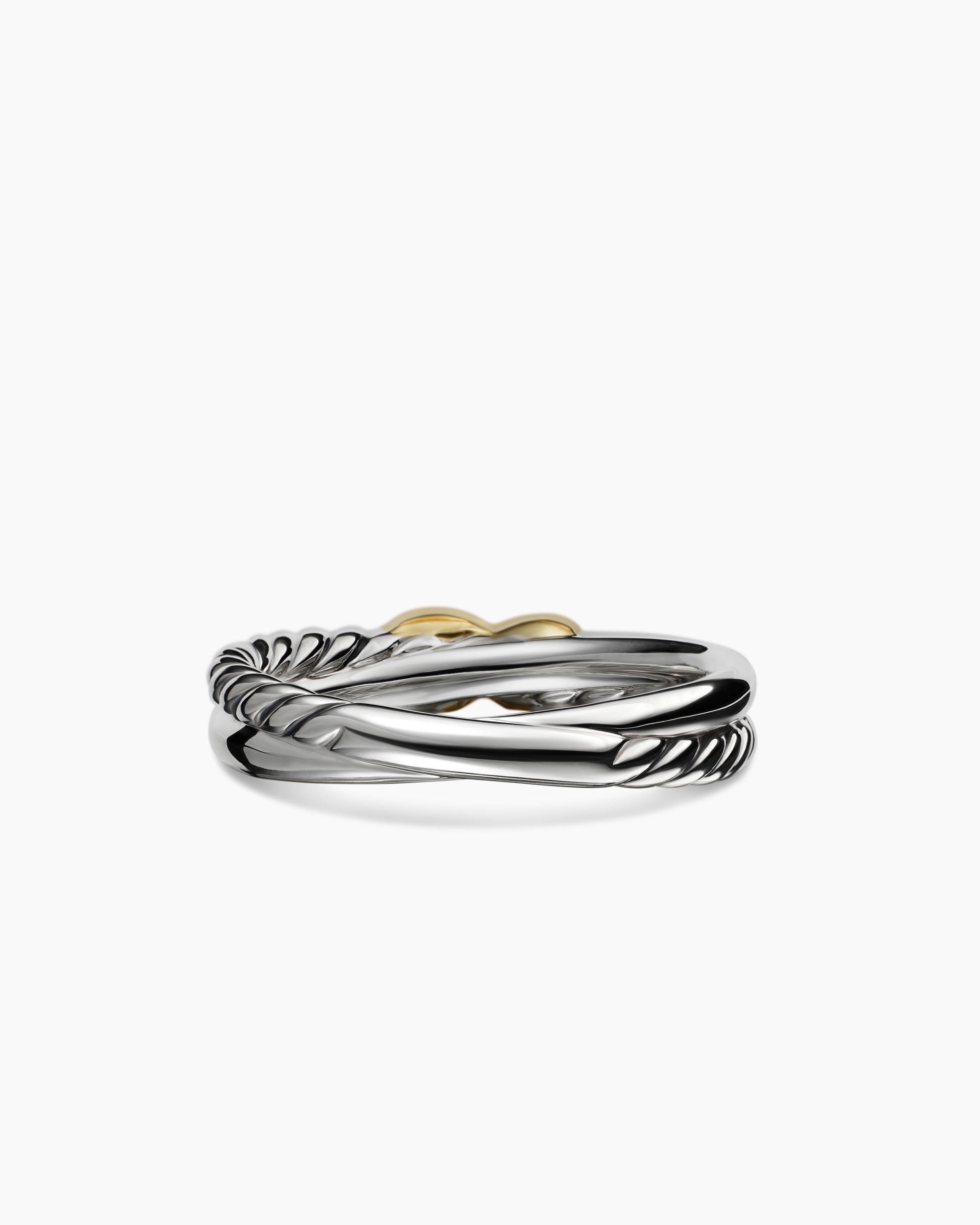 Using a dynamic range of smooth and Cabled cords, strands of silver or gold entwine to create a rhythmic cross of form and movement. The combination of gold and silver—now a David Yurman signature—is a key feature of the collection’s early iterations, which continues to evolve across rings, necklaces, bracelets, and earrings, often detailed with hand-set diamond pavé.