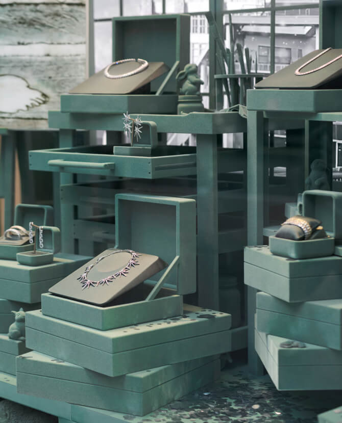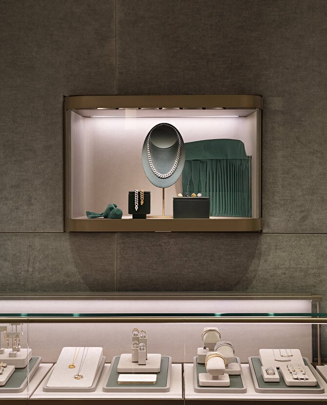 “From the street, the window display becomes a stage—an invitation to step inside this jewelry’s world,” Lubrina said. Within the boutique, the scenography unfolds across two floors, culminating on the mezzanine in what he calls “a full-size version of the loft glimpsed from the street—the same décor, but now traversable, welcoming, tangible.”