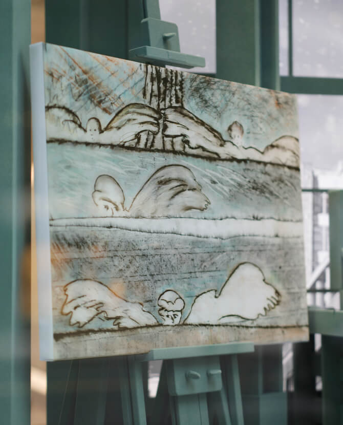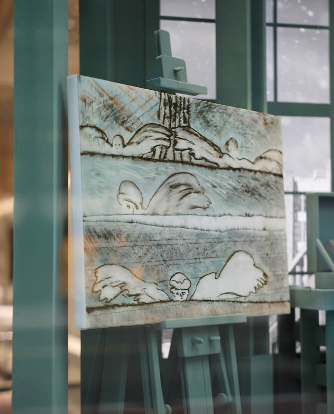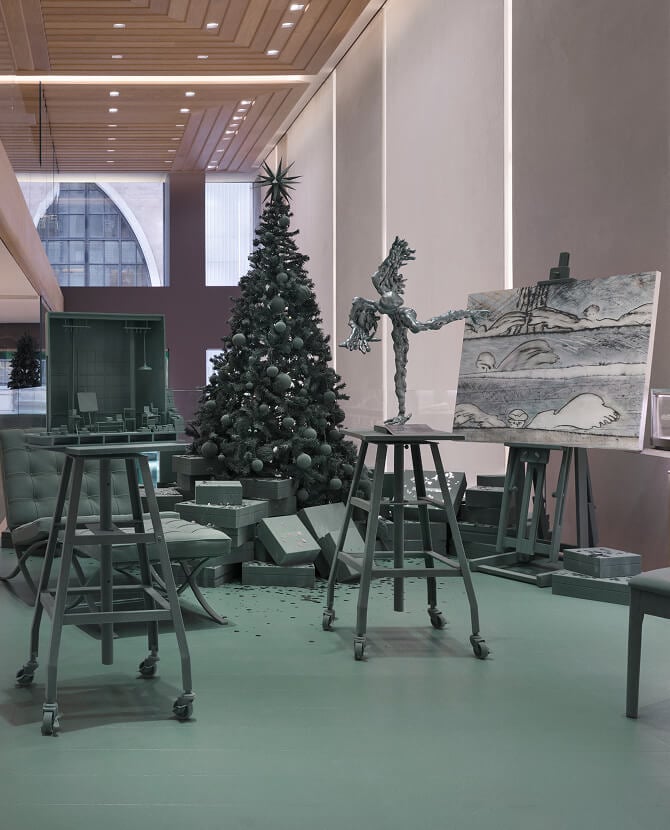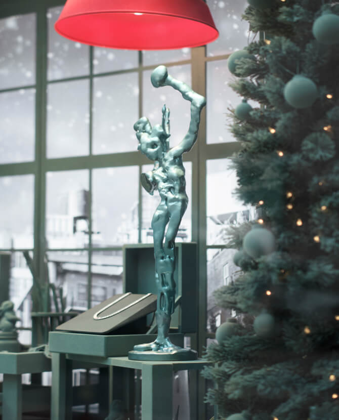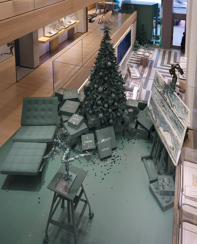 Throughout the imaginative setting, jewelry and gift boxes mingle with holiday ornaments, a glowing tree, and two renditions of David Yurman’s sculptures: After the Bathers (1975) and Icarus 5 (1973). Nearby hangs the mixed-media painting Angels (1978). For the Yurmans, angels have long embodied hope, optimism, and dreams—values that continue to shape their artistic vision.